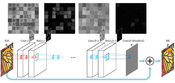 VDSR은 SRCNN에서 발전하여 더 큰 receptive fields와 더 깊은 layer (20개)를 쌓아서 만들어졌다. 또한 learning rate decay를 주어 학습이 용이하도록 설계되었다. 이는 VGG 모델의 형태를 기반으로 만들어졌다. 마지막 layer를 residual layer의 모습으로 high resolution의 이미지와 low resolution의 이미지의 차를 이용하여 나타낸다. 따라서 low resolution과 high resolution의 차이를 잘 알아낼 수 있도록 convolution layer가 학습을 하는 것으로 해석할 수 있다. 따라서 경계부분에 대한 학습이 SRCNN보다 더 정교하게 나타날 수 있음을 의미한다.