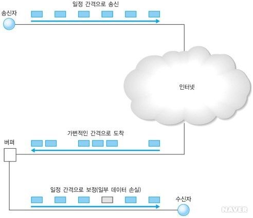 송신자는 일정한 간격으로 데이터를 송신하지만 인터넷이라는 망의 환경에 의해 지연이 다르게 되어 가변적인 간격으로 도착을 하게 된다. 영향을 끼치는 종류로는 대역폭, 네트워크 구조, 라우팅 방식, 전송 프로토콜의 종류가 될 수 있다. 하지만 실시간 환경에서는 수신 프로세스에 도착하는 전송 간격이 그대로 유지 되는 것이 중요하므로 버퍼라는 도구를 사용한다. 가변적인 간격으로 도착하는 데이터를 즉시 수신사에 보내지 않고 지연 버퍼를 통해 다시 일정한 간격으로 보정을 하는 역할을 수행한다.
