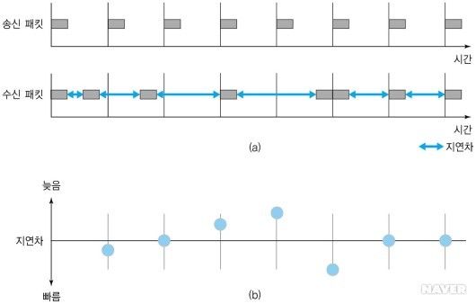 지터는 데이터그램의 도착 지연 시간의 분포를 나타내는 값이다. 도착시간이 일정하지 않고 불규칙적으로 도착하는 정도이다.