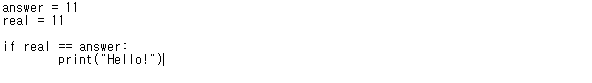 실제로 값이 일치하는 지에 대한 명령을 구현해보도록 하자. 이러한 예시는 로그인을 하는 과정과 같은 곳에서 많이 사용할 수 있다. answer이라는 변수와 real이라는 변수를 가지고 있다. answer는 특정 대답이고 우리를 의미하는 값은 real이다. 따라서 real이라는 값이 answer이라는 값이 같다면 Hello를 출력하도록 하는 명령을 수행하는 것이다.