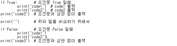 비교 연산자를 사용하는 대표적인 예시가 바로 조건문이다. 조건문이라고 하는 것은 조건에 맞으면 특정 코드 명령을 실행하라는 것을 알려주는 구문이다. 조건문은 if 라는 명령을 통해서 시행할 수 있다. if를 사용하고 그 후 조건을 주고 싶은 구문을 입력한 후 : 와 같은 기호로 마무리를 하게 된다. 그 후 if 구문에 적합하게 되면 실행시키고 싶은 명령들을 다음 번 줄부터 입력하게 된다. 하지만 여기서 중요해야하는 점이 띄어쓰기를 잘 해야 하는 것이다. 조건문의 끝이 어디인지를 구분하기 위해서 if라는 명령어가 나온 구문보다 칸을 띄어서 작성해야 그 명령들이 if 구문의 명령인지를 알 수 있게 된다. 예시를 살펴보면 쉽게 이해를 할 수 있을 것이다.
