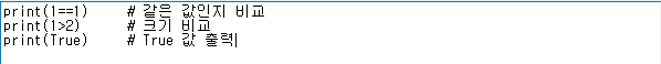 파이썬 언어를 사용하면 문자나 숫자와 같은 데이터 타입 이외에도 True와 False를 나타내어 주는 데이터 타입도 존재한다. 바로 Boolean으로 특정 연산에 대한 결과가 참인지 거짓인지를 판단하여 결과를 True와 False로 나타내어 주는 것이다. 예를 들어보면 1은 1인가에 대한 질문을 해보겠다. 이상하게 들릴 수 있지만 참이라는 것은 알 수 있다. 1은 2가 아니기 때문이다. 앞에서 변수에 대해서 설명을 했는데 변수를 지정할 때에는 = 와 같은 등호 기호를 사용한다. 하지만 같다는 표시를 하는 비교 연산자로 == 와 같이 등호 기호를 두 개를 사용한다. 이렇게 되면 왼쪽에 있는 값과 오른쪽에 있는 값을 비교하는 비교 연산자가 되는 것이다. 이에 대한 결과 값은 True와 False인 Boolean 타입으로 나타나게 된다. 당연히 1은 1이기 때문에 결과 값을 출력하면 True가 나오게 된다. 다른 비교 연산자로는 부등호가 있을 수 있다. > 와 < 같이 숫자에서는 크기를 비교하고 문자열에서는 문자 abc 순서를 비교하여 참이면 True를 거짓이면 False를 출력하게 된다.