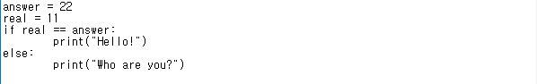하지만 real이 answer이랑 다른 값을 가질 때에 대한 명령은 존재하지 않는다. 이를 위해서 else: 라는 명령어를 사용할 수 있다. 이렇게 되면 real과 answer가 만약 다르면 아래와 같은 명령을 수행하라는 것을 의미하게 된다.
