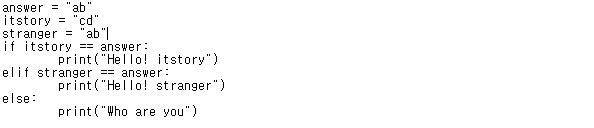 또한 또 다른 조건문을 더 추가시키고 싶을 수 있다. 이럴 때는 elif라는 명령어를 사용하게 된다. 이를 이용하면 elif의 조건문에 만족하는 경우에는 그 밑에 있는 명령어만 출력을 하게 되는 것이다. 이를 통해 하나의 로그인을 하는 것과 같은 형태를 만들어 보게 되면 answer의 대답과 itstory, stranger에 대한 변수를 모두 지정하였다. answer의 값을 바꾸어 가면서 answer가 만약 cd 라는 값을 가지게 되면 Hello itstory를 출력할 것이고 ab를 가진다면 Hello stranger를 그 이외의 값을 가지게 되면 Who are you를 출력하게 될 것이다.