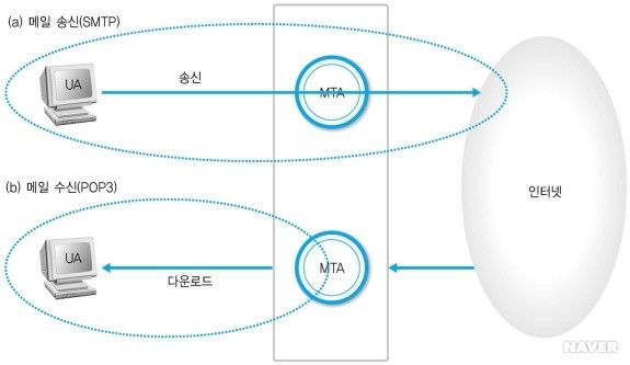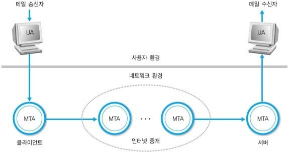 전자 메일 시스템은 기능에 따라 사용자 환경과 네트워크 환경으로 나누어진다. 사용자 환경은 메일 응용 프로그램인 사용자 에이전트(UA)이고 네트워크 환경은 메일을 중개하고 송수신하는 메일 전송 에이전트(MTA)이다. 사용자 에이전트는 사용자 작업환경을 제공하고 사용자 프로그램 입력 정보는 표준화된 형식으로 정의된다. 메일 전송 에이전트는 받는 메일 서버인 POP 프로토콜과 보내는 메일 서버인 SMTP 프로토콜로 이루어진다.