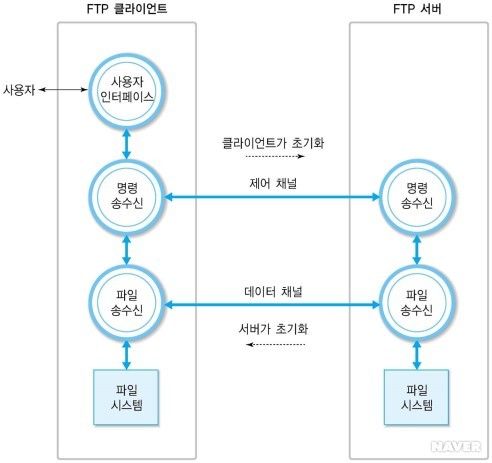 FTP는 일반 응용 프로그램과 달리 클라이언트와 서버 사이에 제어 채널과 데이터 채널이라는 두 가지 연결이 존재한다. 제어 채널은 FTP 프로토콜의 명령과 응답을 전송하고 데이터 채널은 복사하려는 파일의 내용을 전송한다. 구성 요소로 사용자 인터페이스 모듈, 명령 송수신 모듈, 파일 송수신 모듈, Well-known 포트가 있다. 사용자 인터페이스 모듈은 사용자 명령을 해석하여 명령 송수신 모듈에 전달하고 명령 송수신 모듈은 제어 채널을 설정하고 사용자 명령을 FTP명령으로 전환하여 제어 채널로 전송한다. 파일 송수신 모듈은 파일 송수신 요구가 발생할 때마다 데이터 채널을 설정하여 파일 복사, 파일 목록 전송 기능을 수행한다. 제어 채널의 경우에는 클라이언트가 초기화를 하고 데이터 채널의 경우에는 서버가 초기화를 진행한다. Well_known 포트는 제어 채널은 TCP 21번이고 데이터 채널은 TCP 20번이다.