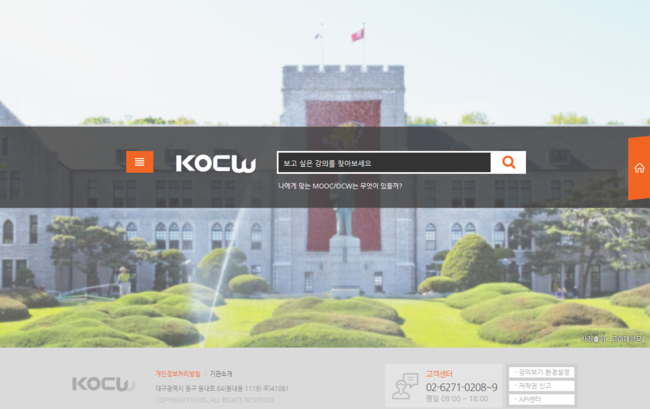 위의 두 MOOC는 외국 온라인 강의이다. 따라서 한국어 지원에 있어 미흡한 점이 있다. 영어에 취학한 학생들을 위해서는 한국의 MOOC인 KOCW를 추천한다. KOCW는 한국 대학들의 강의들이 올라온다. IT 공학 관련된 강의가 천개가 넘을 정도로 국내에서는 큰 규모를 자랑한다. 모든 강의가 무료로 진행을 할 수 있으나 수료증을 받는 시스템은 갖춰져 있지 않다. 하지만 한국어로 들을 수 있기 때문에 이해를 하는 과정은 빠를 수 있다. 하지만 최신 기술의 동향에 대해서는 외국 MOOC에 비해 떨어지는 것이 많다. 따라서 학교 이론 공부를 하는 과정을 수행할 때는 매우 도움이 될 것으로 보인다. 외국의 MOOC의 경우 실제로 온라인 강의를 수강하는 느낌을 크게 받을 수 있다. 퀴즈도 풀고 과제도 제출하는 등 적극적으로 수업에 참여할 수 있는 환경을 만들어준다.