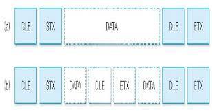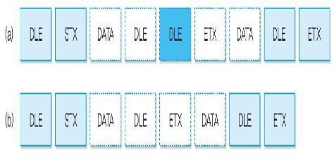 문자 프레임은 프레임의 내용이 문자로만 구성된다. 프레임의 시작과 끝에 특수 문자를 사용하여 구분하는데 시작에는 DLE/STX가 나오고 끝에는 DLE/ETX를 두어 프레임을 다른 정보와 구분하게 된다. 하지만 데이터 안에도 DLE/STX나 DLE/ETX 와 같은 문구가 포함되어 있을 수 있어 데이터를 읽는 과정에서 혼선을 일으킬 수 있다. 이러한 문제를 해결하기 위해 문자 스터핑이라는 기법을 사용한다. 문자 스터핑은 데이터에 DLE가 존재하면 강제로 DLE를 추가하는 작업을 한다. DLE가 두 개가 연달아 나오게 되기 때문에 특수 문자로 인식하지 않는다. 수신측에서 두 개의 DLE가 나오면 뒤에 있는 DLE를 제거하여 데이터를 읽는다.