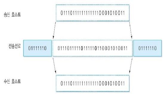 비트 프레임은 임의의 비트 패턴을 전송하는 것이다. 문자 프레임의 경우 문자를 사용하기 때문에 8비트로 떨어져야하는 반면 비트 프레임은 비트 그 자체가 데이터가 되므로 어떠한 비트 크기를 가져도 상관이 없게 된다. 비트 프레임은 프레임과 시작과 끝을 나타내는 비트 패턴으로 플래그(01111110)를 사용한다. 하지만 비트 프레임 역시 데이터에도 플래그와 같은 비트를 가지는 데이터가 존재할 수 있기 때문에 이를 구분해줄 수 있는 기능이 필요하다. 이러한 역할을 하는 것이 비트 스터핑이다. 비트 스터핑은 데이터에서 1이 연속해서 5개가 나타나게 되면 강제로 0을 추가해서 플래그와 같은 비트를 가지는 데이터 구성을 없앤다. 나중에 수신측에서 읽을 때는 0을 제거하여 읽어 들어간다.