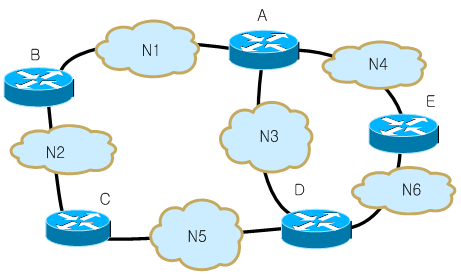 N6으로 가는 경우 D라우터와 E라우터 중 두 구간이 모두 가능하나 E의 경로가 더 빠르다는 가정을 하면 E가 선택된다.