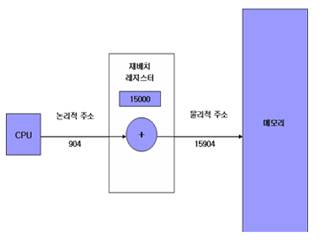 MMU가 메모리 관리를 하는 방법에 대해서 조금 더 상세히 들어가 보자. MMU는 프로그램이 동작할 때 필요한 데이터나 동작들을 메모리의 특정 주소 위치로부터 가지고 와야 하는데 이는 프로그램이 만들어질 때 코드화 되어 있다. 따라서 항상 같은 위치의 메모리 주소로부터 데이터를 불러오게 된다. 하지만 메모리에 프로그램을 적재할 때 항상 같은 위치에 프로그램을 올릴 수는 없다. 어떤 날에는 0번지에 올리기도 하고 다른 날에는 500번지에 올리기도 한다. 이는 메모리 공간에서 빈 공간을 찾아 프로그램을 올리기 때문에 알 수가 없다. 그래서 이를 맞추어 조절해주는 역할을 하는 것이 바로 MMU의 재배치 레지스터이다. 재배치 레지스터는 CPU가 프로그램을 실행시킬 때 코드를 읽어 들어가는데 코드에서 특정 위치의 메모리 주소로부터 데이터를 가지고 오라는 동작을 할 때 도움을 준다. CPU는 분명 특정 위치를 가르쳐 주었는데 재배치 레지스터는 이의 주소에서 메모리에 프로그램이 있는 위치 주소를 더해서 계산을 해서 CPU에서 원하는 데이터 위치와 메모리상에 프로그램의 위치를 맞게 맞추어 준다. 여기서 CPU에서 MMU로 보내는 주소를 논리 주소라고 하고 MMU에서 메모리로 보내는 주소는 물리 주소라고 한다.