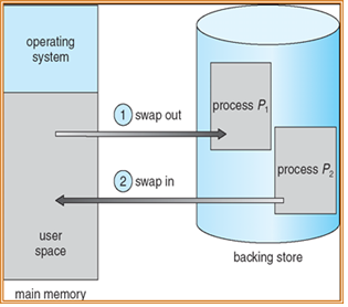 Swapping이라는 기술은 메모리에 적재되어 있으나 현재 사용되지 않고 있는 프로세스를 관리하는 역할을 한다. 메모리 활용도 높이기 위해 Swapping을 이용하면 현재 사용되지 않는 프로세스를 Backing store로 몰아낸다. Backing store는 하드디스크의 일부분이다. 이런 과정을 swap-out 이라고 한다. 이와 반대로 필요한 부분이 생기면 그 부분에 대해 메모리로 적재해서 올려주는 swap-in이라고 한다. MMU의 재배치 레지스터를 사용하므로 적재 위치는 메모리의 빈 공간 어디에도 적재가 가능하다. 이런 작용으로 메모리의 활용도를 높일 수 있어 효율이 높아진다. 하지만 프로세스의 크기가 크면 Backing store 입출력에 따른 부담이 크다.
