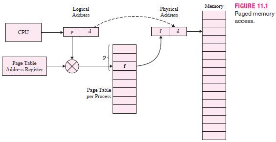 CPU가 내는 주소는 논리 주소(Logical address)라고 한다. CPU에서 보낸 논리 주소는 MMU인 페이지 테이블을 통해 물리 주소(Physical address)로 바뀌어서 메모리에서 찾게 된다. 논리 주소는 2진수로 표현된 m개의 비트이다. 하위 n비트는 오프셋 또는 변위를 나타내고 상위의 m-n비트는 페이지 번호를 나타낸다. n비트는 페이지를 어떤 크기로 나누는 정도에 따라 다르게 된다. 예를 들어 16바이트로 페이지를 나눈다고 생각하면 n은 4비트가 된다. 2진수로 표현된 값이기 때문이다. 페이지 테이블에서 페이지 번호를 가져와서 해당하는 프레임 번호를 가져오게 된다. 페이지 번호는 페이지 테이블의 인덱스 값으로 인식한다. 페이지 번호에 해당하는 페이지 테이블의 값과 n비트의 값을 가진 물리 주소로 바뀌게 된다.