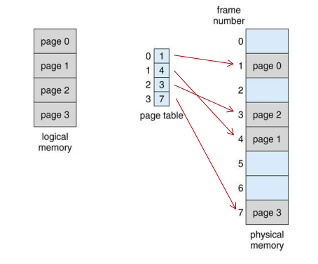 프로세스를 자르는 단위는 페이지이다. 이에 동일한 크기로 메모리를 자른 것을 프레임이라고 한다. 같은 크기로 페이지와 프레임으로 잘라져 있기 때문에 페이지를 프레임에 할당하면 딱 맞아 떨어진다. 이 때 페이지를 관리하는 MMU는 페이지 테이블이 된다. 페이지 테이블 안에 있는 개수는 프로세스를 몇 등분하는가에 따라 결정된다.